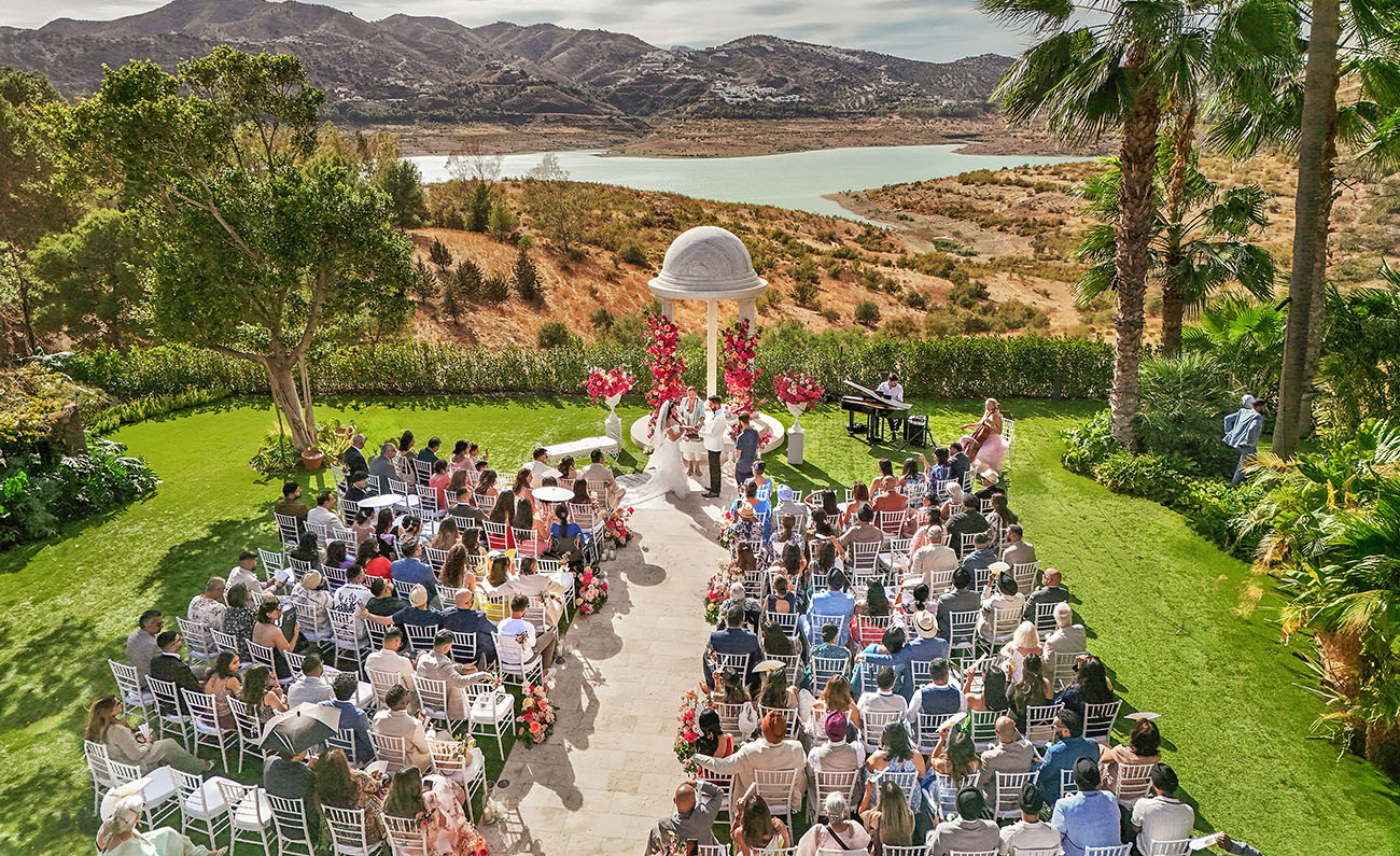 Desde el primer momento, cada detalle estuvo cuidadosamente planeado para crear una experiencia inolvidable. La ceremonia, llena de tradición y color, se llevó a cabo en un escenario natural rodeado de las vistas espectaculares del embalse de La Viñuela. Los vibrantes tonos de los saris, las joyas deslumbrantes y los arreglos florales exquisitos transformaron el lugar en un auténtico paraíso. 🌸🌺